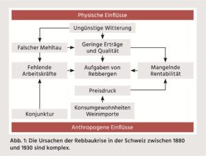 Es ist gängiges Narrativ, dass es die Reblaus war, die diesen Schwund der Rebfläche verursachte. Tatsächlich waren gesamtschweizerisch nur wenige Prozent der Rebberge von der Reblaus befallen (Altwegg 2020). Am stärksten betroffen waren die Westschweizer Kantone Waadt, Neuenburg und Genf. Viele Kantone und Rebgebiete blieben bis nach 1930 reblausfrei, so die Kantone St. Gallen, Schaffhausen und Graubünden oder das Schenkenbergertal und das thurgauische Thurtal. Die Ursachen der Rebbaukrise sind viel komplexer (Abb. 1).