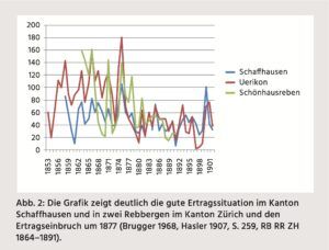 Nach 1875, als die grösste Weinernte eingebracht wurde, seit es regelmässige Aufzeichnungen gibt, und der quantitativ guten, aber qualitativ schlechten Ernte 1876 kam es zu einem Ertragseinbruch (Abb. 2).