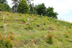 Auf der Suche nach einer Baumschule, welche diese Sorten vermehrt, sind die Autoren auf die Pépinière Quissac in der Region Marseille aufmerksam geworden. Beim Austausch mit der Expertin Miriam Quissac wurde der Fokus auf frostresistente Sorten von Gregory Levin und weitere Züchtungen für den Anbau in der Nordwestschweiz gelegt. Im Herbst 2017 wurden auf einer ehemaligen Rebparzelle 15 verschiedene Sorten gepflanzt. Diese liegt im Jurapark Aargau und war zuvor während rund 30 Jahren mit Pinot noir bepflanzt. Die Versuchsparzelle weist eine Südexposition auf und liegt auf einem Standort mit einem Parabraunerde-Boden. Da die Wachstumsentwicklung der gepflanzten Sorten nicht den Erwartungen entsprochen hat, wurde eine zweite Bepflanzung vorgenommen. Diese erfolgte im Frühling 2020 und erweiterte den Sortengarten um 23 frostresistente Sorten (Abb. 1).