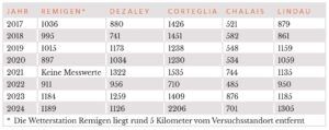 Tabelle 1: Temperatursumme in ausgewählten Schweizer Regionen mit einer Basistemperatur von 10 °C, basierend auf www.agrometeo.ch.