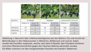 An den Standorten Wädenswil, Leytron und Mendrisio wurden im Jahr 2025 Praxistests mit dem KI-Modell durchgeführt und mit bisher gefahrenen Standardmethoden basierend auf Entscheidungshilfen wie dem Agrometeo-Modell verglichen. Für beide Verfahren galt derselbe Spritzplan als Grundlage. Als Kontrolle blieb eine Parzelle unbehandelt. Wie bei der Datenerhebung erfassten die Bonitur-Mitarbeitenden in allen Verfahren und der unbehandelten Kontrolle einmal wöchentlich den Infektionsverlauf des Falschen Mehltaus (Abb. 2). Dabei untersuchten sie in jedem Verfahren an 20 Stöcken jeweils einen Trieb sowie zehn Trauben des jeweiligen Stocks.