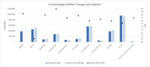 Tab. 2: Erntemengen Müller-Thurgau 2025 verglichen mit dem 10-Jahres-Durchschnittsertrag derselben Sorte pro Kanton. (*Anstelle von Müller-Thurgau ist Chasselas die weisse Hauptsorte)