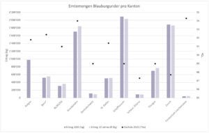Tab. 3: Erntemengen Blauburgunder 2025 verglichen mit dem 10-Jahres-Durchschnittsertrag derselben Sorte pro Kanton.